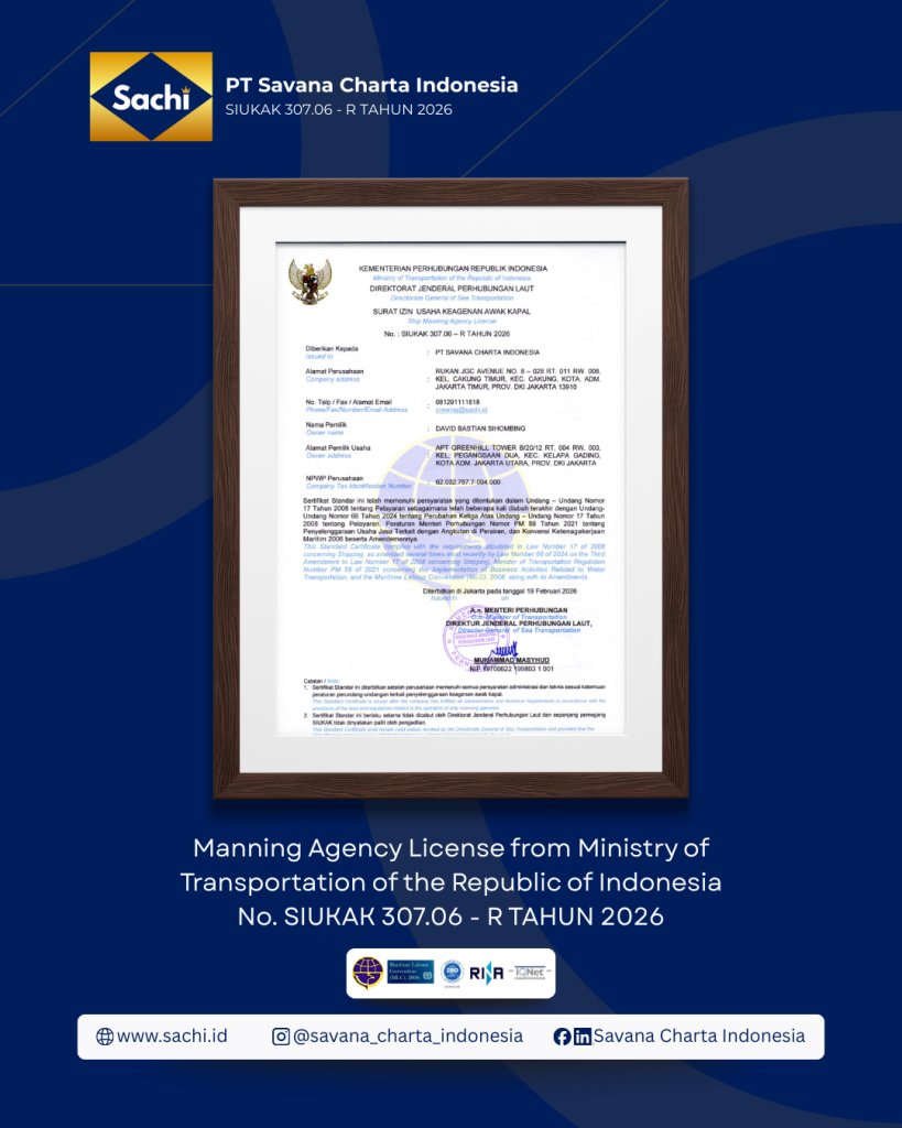 PT Savana Charta Indonesia is a Ship Manning Agency Company licensed by the Ministry of Transportation of the Republic of Indonesia under License Number SIUKAK 307.06 – R YEAR 2026, committed to providing the best service and personal attention to each client we serve.